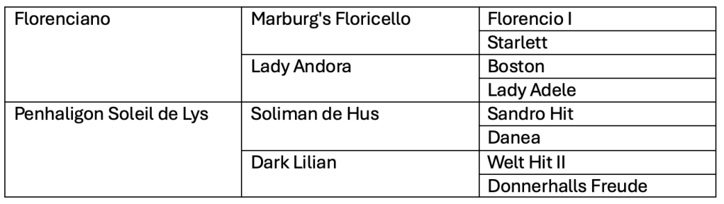 - Dam: Penhaligon Soleil de Lys (Soliman de Hus x Welt Hit II x Donnerhall)